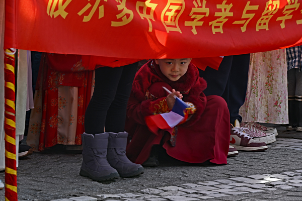 Au cœur de la foule, un enfant se glisse sous une grande banderole comme on se glisse dans un monde nouveau. Entre deux cultures, il brandit un petit drapeau avec la fierté innocente de ceux qui n’ont pas encore appris les frontières. La jeunesse, c’est cela : un pont vivant, un regard qui relie les mondes, un sourire qui traverse les langues.