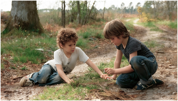 Assis au milieu d’un sentier, deux enfants plongent dans le minuscule comme on plonge dans un secret. Une feuille, une pierre, un insecte… tout devient matière à s’émerveiller. La jeunesse, c’est cette capacité à transformer un simple chemin en terrain d’aventure, à faire du monde un livre ouvert dont chaque page attend d’être découverte.